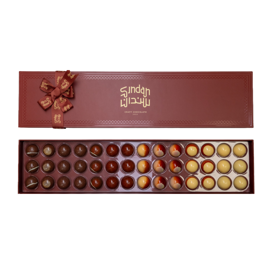 كراميل بنكهة الهيل والزعفران، مغلّف بشوكولاتة داكنة بنسبة ٦٢٪ من أوغندا